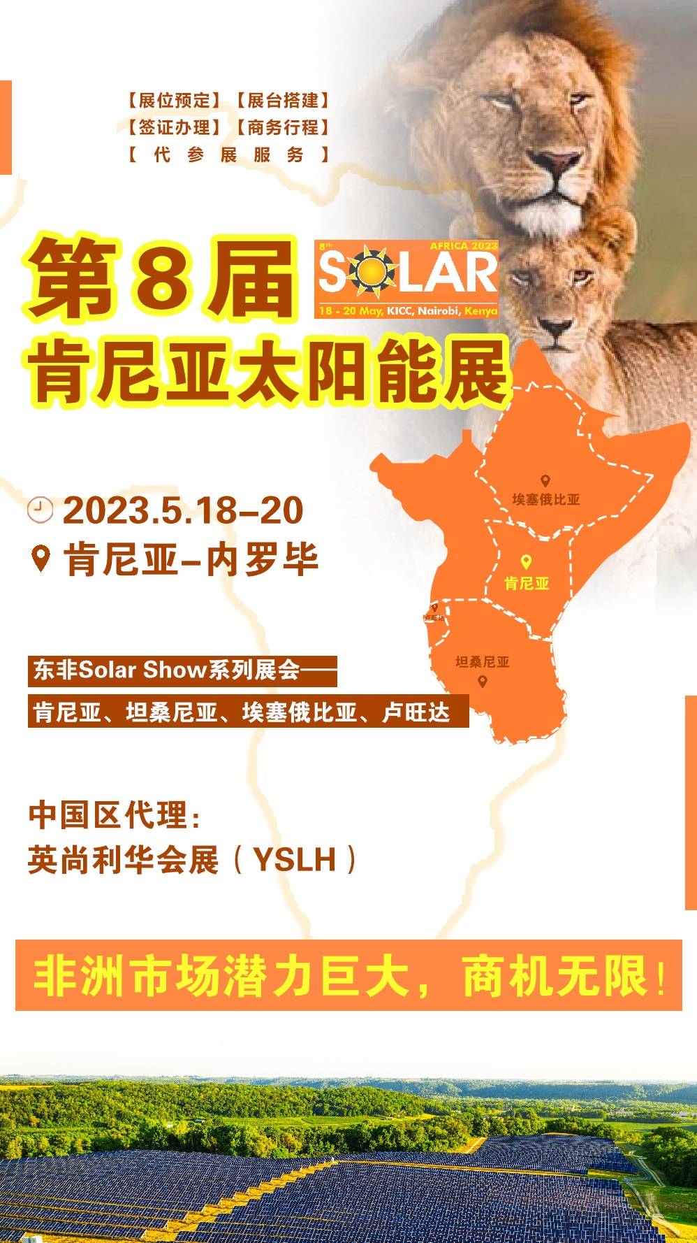 Solar Africa Kenya 是 肯尼亞重要的太陽能行業交流展示 平臺, 在 整個 東非和中非地區 富有 盛名 。由于非洲對太陽能項目和產品的需求不斷增加,預計 2023 年的 全球主要太陽能行業玩家在該展會的 參與率將至少增加 30% 。 肯尼亞國際太陽能展是目前肯尼亞,乃至整個東非地區規模最大,影響力最強的太陽能行業盛會。主辦方 Expo Group 是非洲和中東地區最有影響力主辦方, 在坦桑尼亞、埃塞俄比亞和盧旺達等國家舉辦的太陽能、照明、機械行業展會也備受關注。憑借多年優秀的海外組展經驗,英尚利華從成立至今服務上百家展商赴非洲、中東、南亞、中南亞、歐美地區參展。